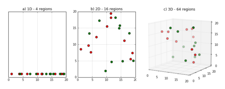 아래의 그림처럼 차원이 커지게 된다면 데이터 샘플 간의 거리가 멀이지게 되고, 데이터 분석에서 어려움을 겪게 된다. 이를 '차원의 저주'라고 부른다.