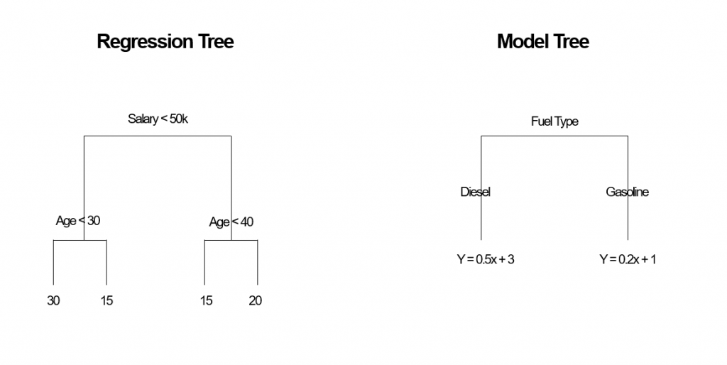 간단하게 설명하면 leaf node의 값이 특정 값(노드 값들의 평균)으로 떨어진다면 회귀 트리, 함수로 떨어진다면 모델 트리라고 볼 수 있다.