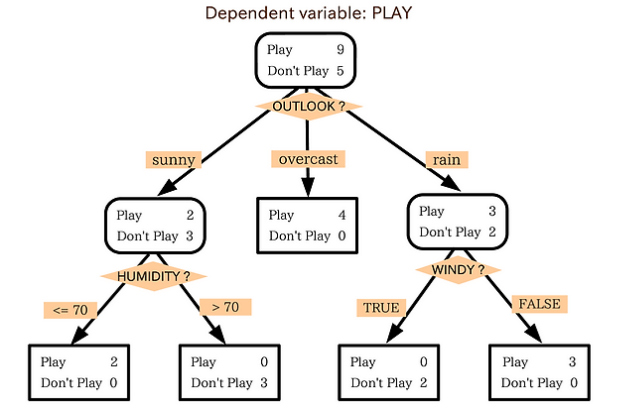 위 문제는 Play(O)와 Don't Play(X) 두가지로 나뉘는 binary classification 문제로, 날씨(outlook)과 습도(humidity)와 바람이 부는 정도(windy)에 따라서 분류를 진행했다.