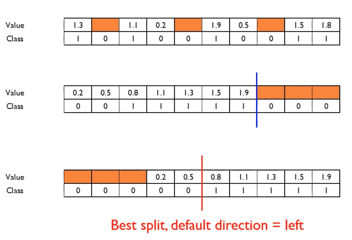 아래 그림을 살펴보면, 모든 결측치를 왼쪽에 배치했을 때 더 좋은 split point를 찾을 수 있으므로 해당 branch에서 결측치 데이터를 분류할 방향을 왼쪽 leaf로 설정하게 된다.